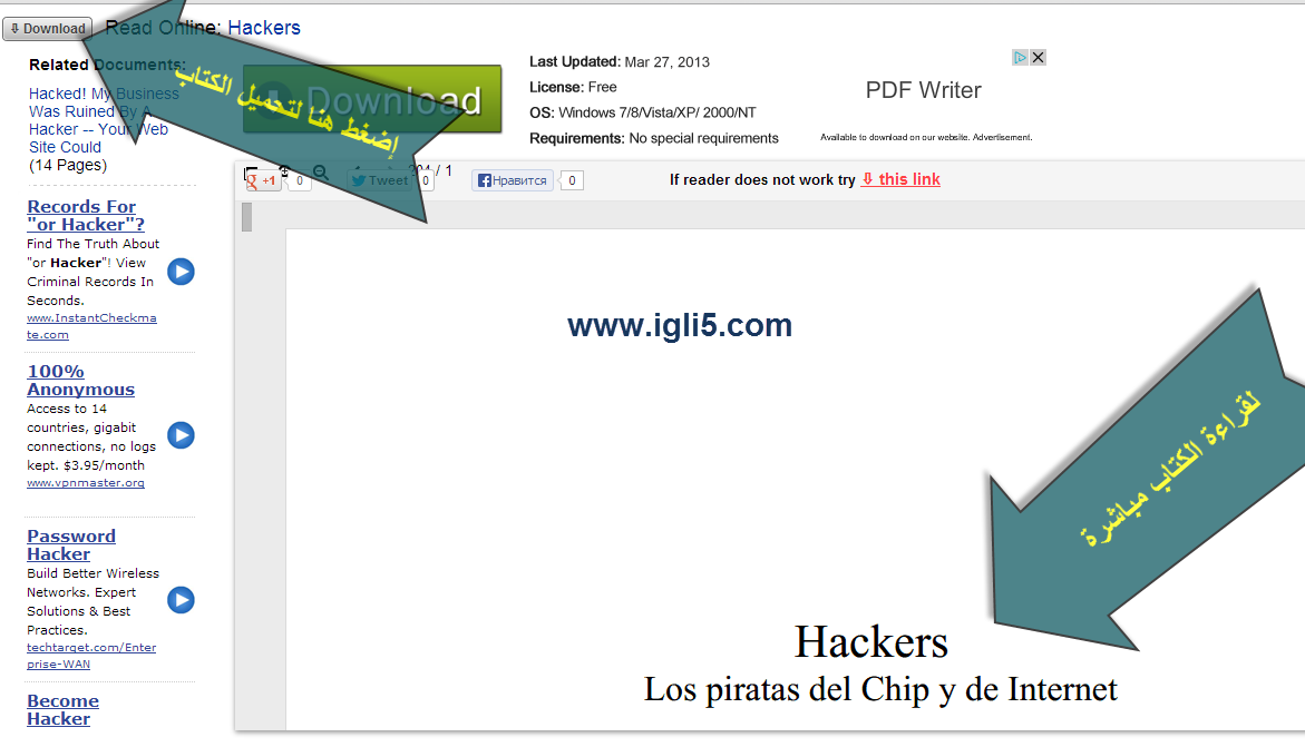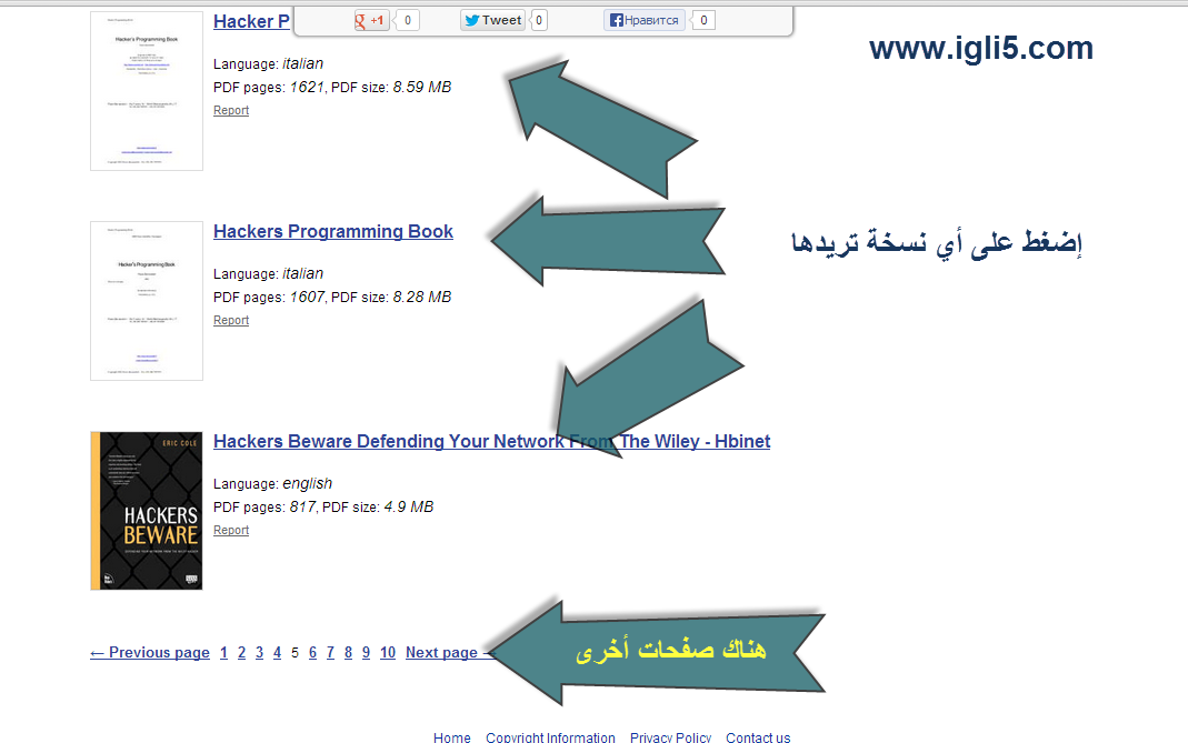 لاحظ معي أني وضعت كلمة هاكر للحصول على كتب إلكترونية الخاص بهذا المجال ، وشاهد معي في الصورة التالية أن الموقع يستعرض مجموعة من النسخ بلغات مختلفة تضغط على أي واحدة تريدها لتصفح الكتاب أو تحميله على جهازك