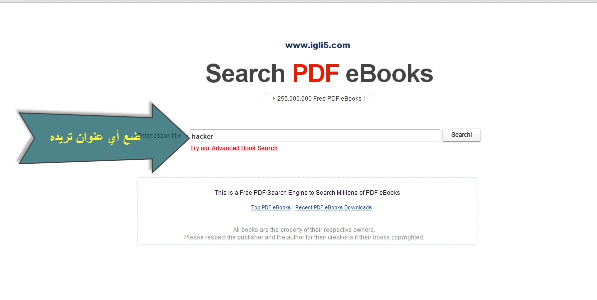 بعد تسجيل الدخول ، قم بوضع إسم أي مجال تريد البحث له عن كتاب إلكتروني في مربع البحث كما هو واضح في الصورة التالية